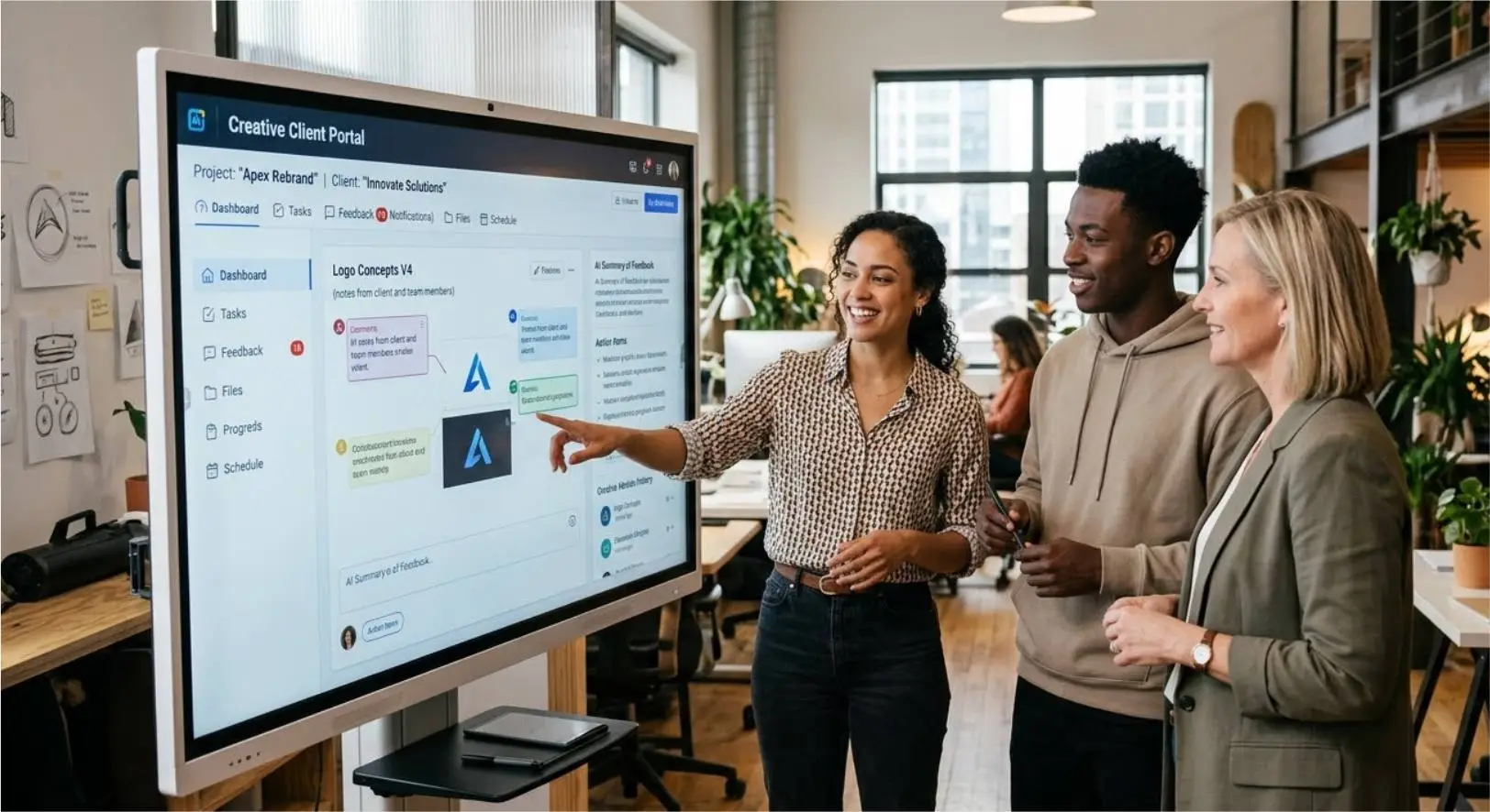 An AI client portal is a centralized platform where agencies and clients collaborate on creative projects.